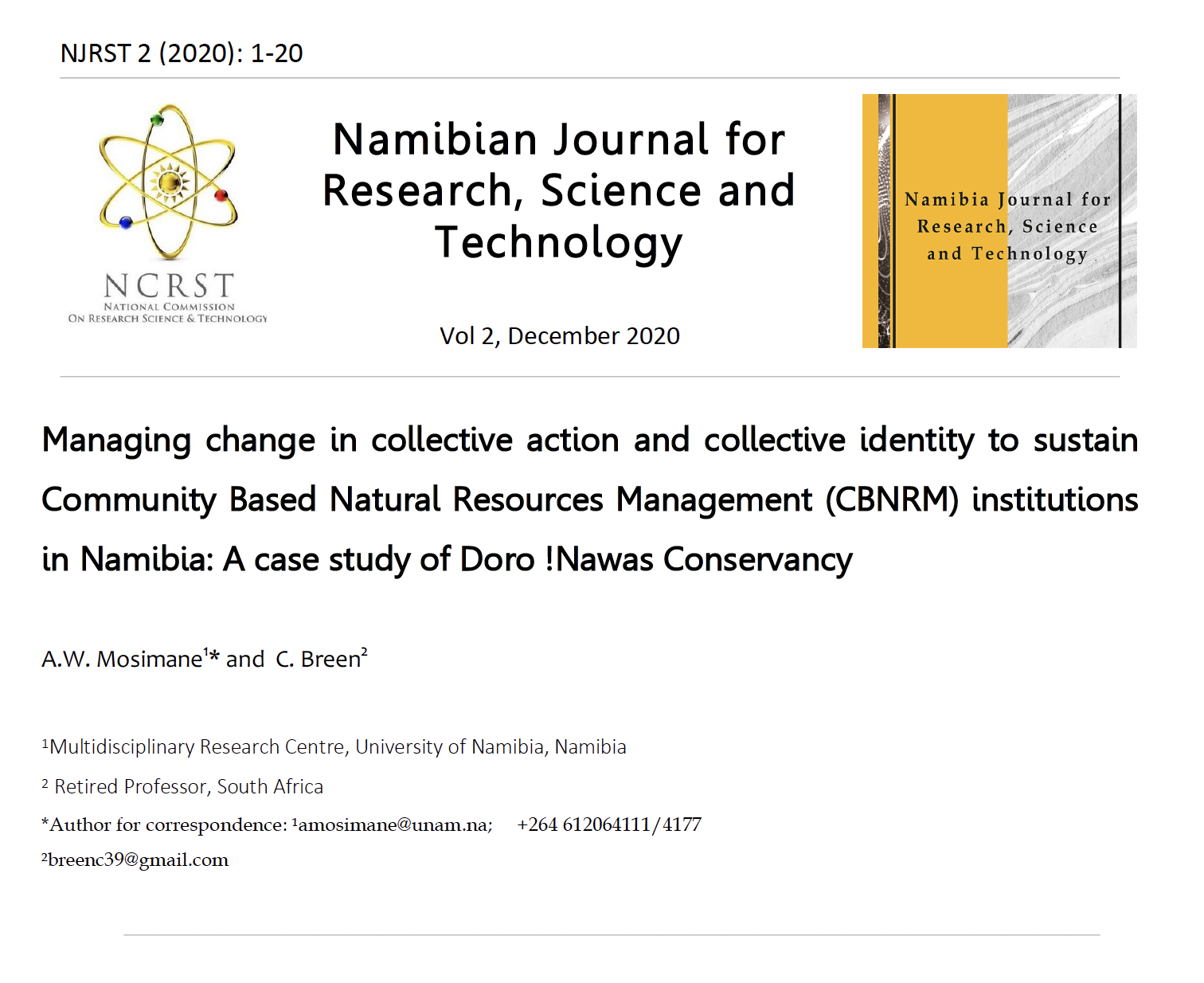 In the first paper, Mosimane and Breen, adopted a thematic analysis approach with deductive analysis to postulate collective action and collective identity taken to sustain and manage Community Based Natural Resources Management (CBNRM) institutions in Namibia. The unique contribution is the blend of qualitative approach with embedded quantitative style. This study should assist in evidence- based policy through its modest contribution to