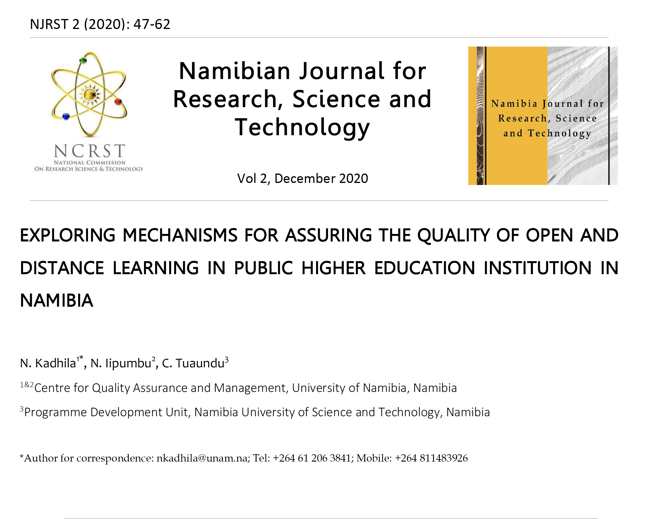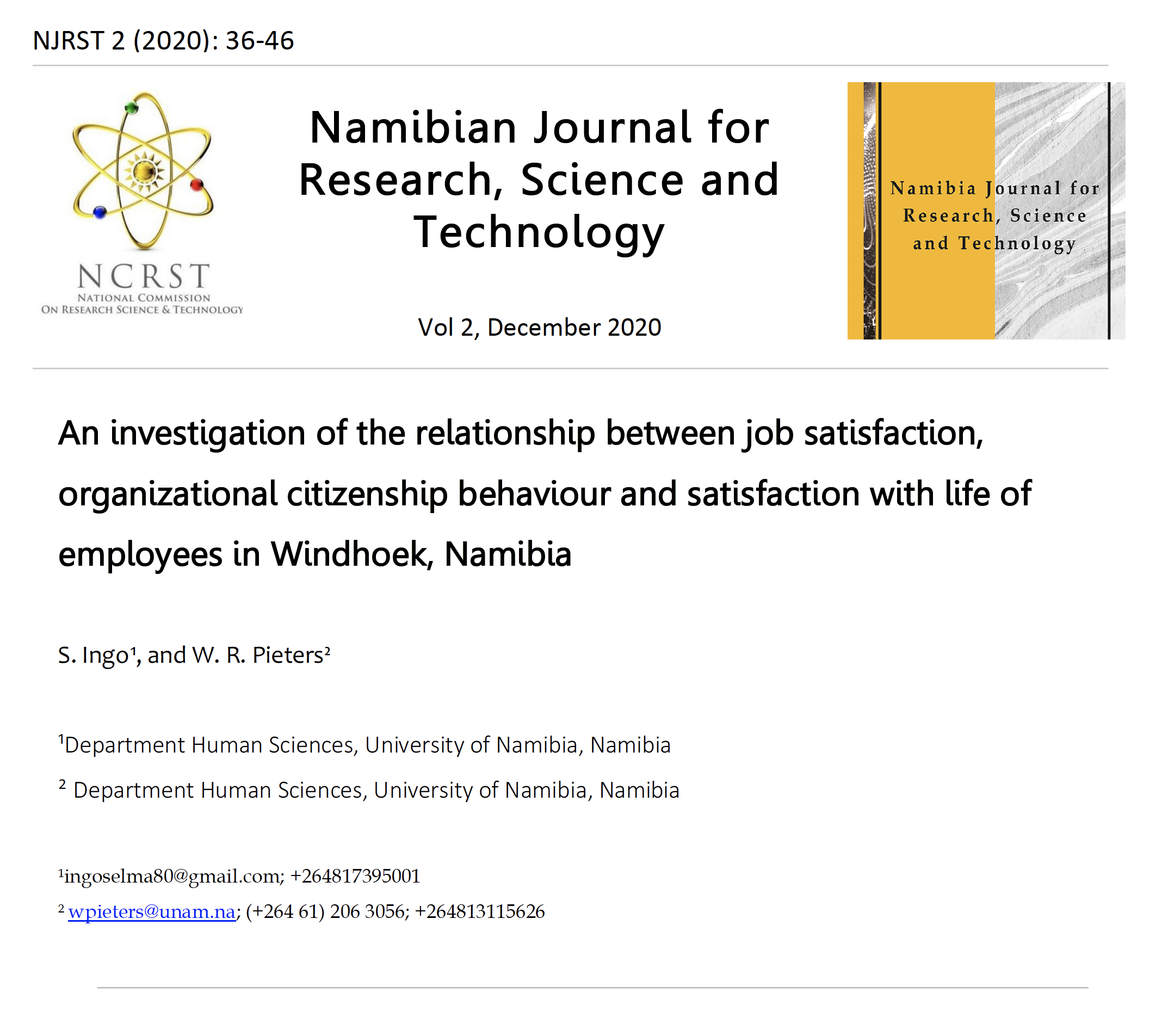 From the social sciences, Ingo Pieters investigated the relationship between job satisfaction, organizational citizenship behaviour and satisfaction with life of employees in Windhoek, Namibia. The study demonstrated that decision making, rewards, promotion and supervision should be fair and adequate. It further suggests possible interventions which could focus on the increase of incentives, salaries or benefits, and recognition through employee of the month initiatives. It concludes with a policy intervention that supervisors should receive leadership training to enhance effective leadership at the workplace. Similar to this, is the paper that explored mechanisms for assuring the quality of open and distance learning (ODL) in public higher education institution (HEI) in Namibia. The paper considered how policies can be used to enhance innovative education learning techniques. It was, therefore, found that the ODL criteria were not sufficiently and explicitly covered and that the systems were biased towards the conventional, face-to-face modes of delivery. Based on these findings, a research informed policy recommended that both HEIs and Namibia Qualification Assurance Authorities should have in place clearly and explicitly defined Quality Assurance criteria and procedures for ODL in order to adequately address the unique quality challenges faced by ODL.