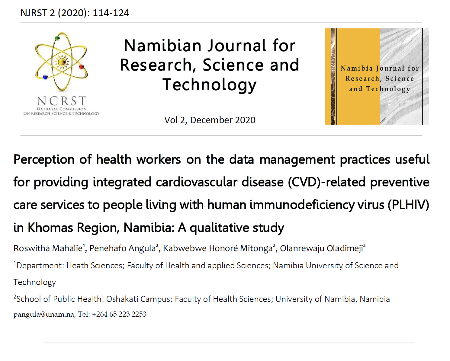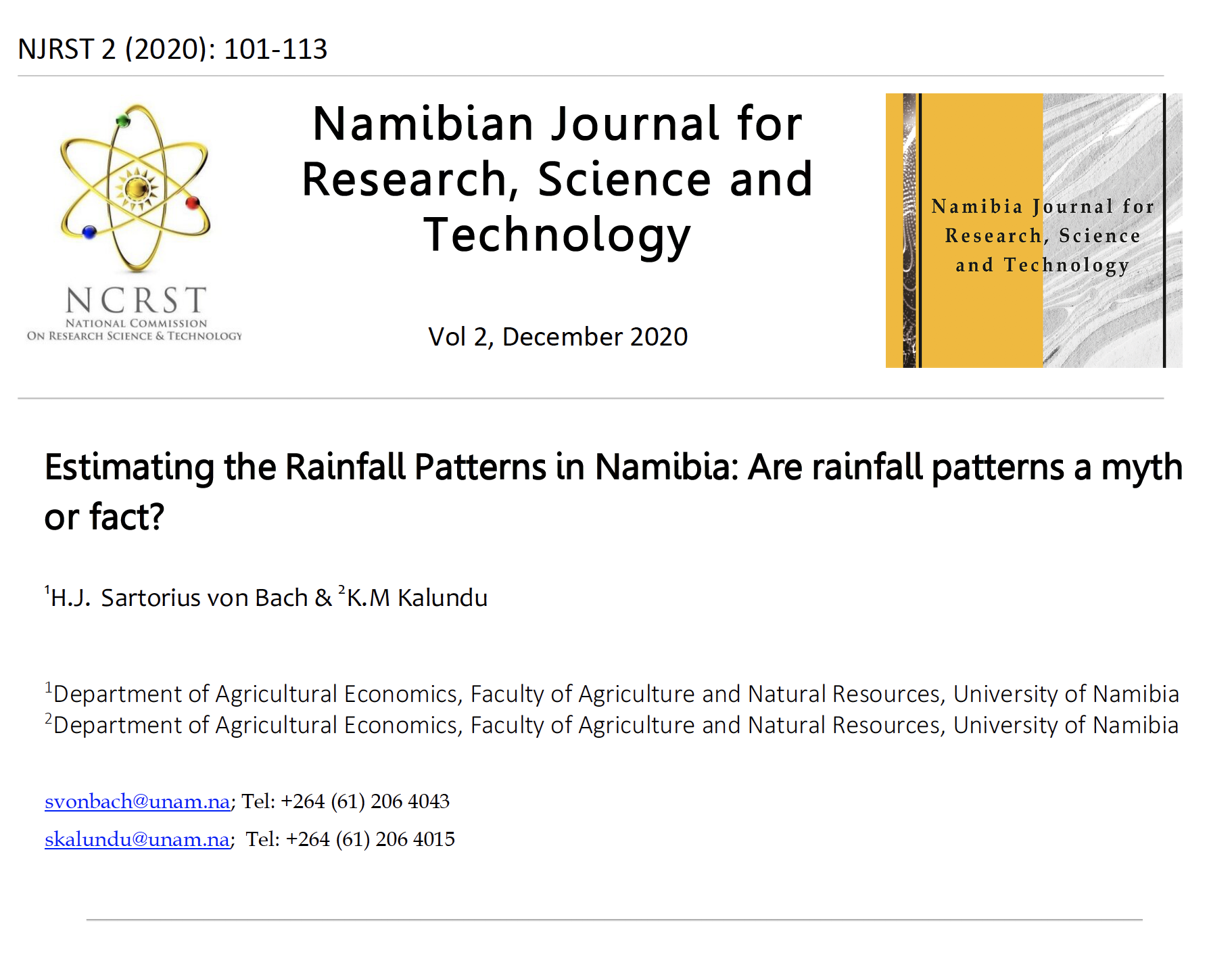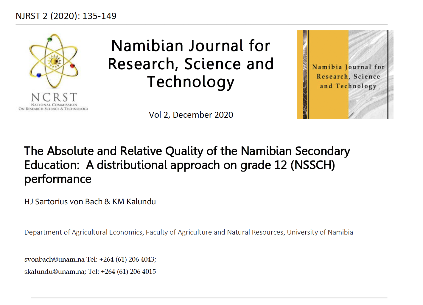 This speaks directly to what is contained in this volume. This is the second volume of NJRST. It is a good mix of research work reflecting a spectrum running from one pole of natural and allied sciences to the other pole of social sciences. The authors have demonstrated two things. First, that research has to be contextualized. Second, that research has to be contribute to policy. In other words, this volume demonstrates the core message of science for society. The few works summarized below clearly illustrate this.